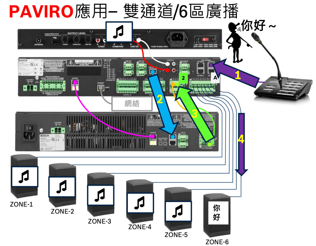- PVA-4CR12 (PAVIRO系列主控制器)經過處理後吧(你好)100V 信號傳輸到ZONE-6 點揚聲器中令6區的人們聽到小明說的(你好)廣播出來