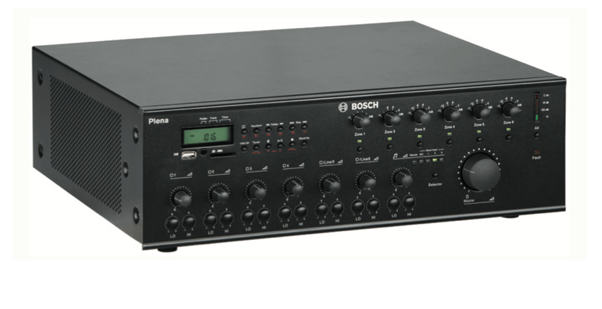 Plena All‐in‐One System的主要產品是一體機裝置,它整合了以下組件:一個240瓦的單聲道混合放大器。 此混合擴大機可連接最多6個麥克風和3個輔助音源訊號,並透過優先權或VOX切換進行混合。 透過單一衰減控制,輸出訊號可以傳送到6個不同的區域。 該裝置還可以安裝額外的功率放大器(如LBB1935/20)作為備用放大器,或用於雙聲道操作。 此外,裝置還配備了SD和USB播放器,可從SD卡和USB裝置播放MP3格式的檔案。 它還整合了一個AM/FM調諧器,可以接收廣播頻道。