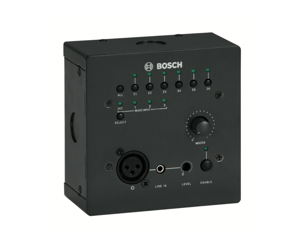 可以級聯連接多個六區呼叫站點,以呼叫任意組合的區域。 可連接有線遠端控制牆面面板來控制音樂分配到各個區域,並具有總音量控制。 牆面面板上提供了麥克風和線路輸入,以連接本地訊號源。