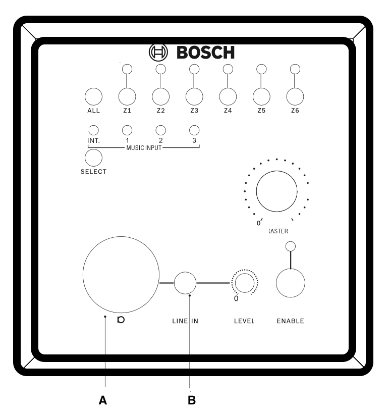 B:線路輸入:本裝置具有3.5毫米(1/8吋)立體聲電話插孔,用於連接本地音樂來源,例如智慧型手機的耳機輸出。 此訊號將與牆裝面板上的麥克風輸入(5)以及一體機裝置的輸入1-6上的任何麥克風/線路訊號混合。 訊號的優先權與一體機裝置的音樂輸入相同。 此線路輸入的靈敏度為200毫伏,非平衡,立體聲訊號將轉換為單聲道,輸入阻抗為10千歐姆。
