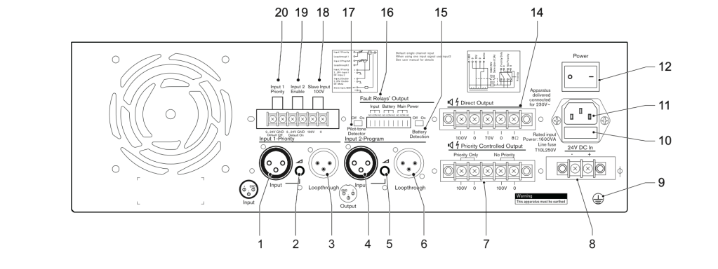 - 優先權線路輸入1 (XLR/平衡) – Priority line input 1 (XLR/balanced)